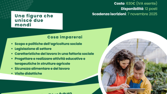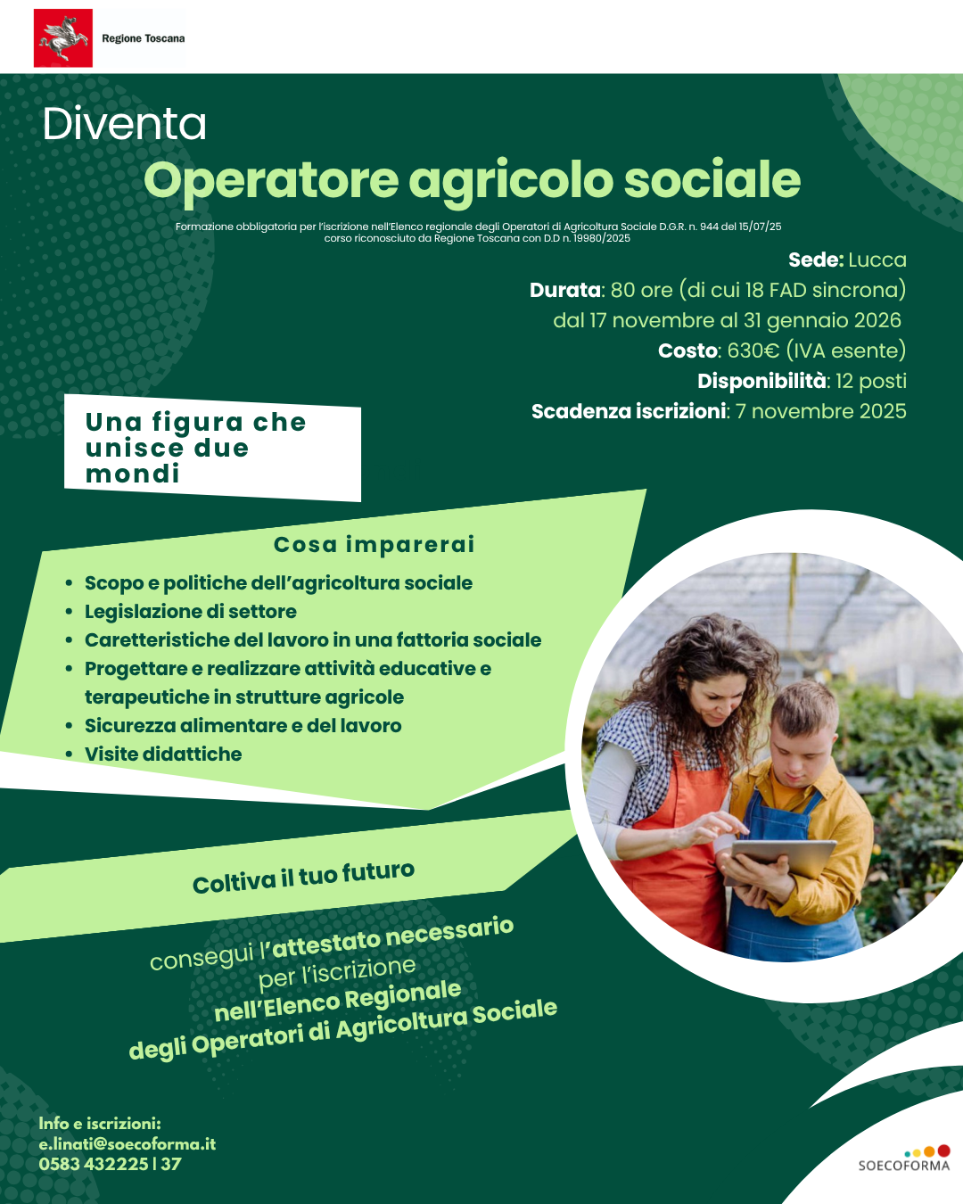 17 Ottobre, 2025Operatore Agricolo Sociale FORMAZIONE OBBLIGATORIA PER L’ISCRIZIONE NELL’ELENCO REGIONALE DEGLI OPERATORI DI AGRICOLTURA SOCIALE (D.G.R. n. ...